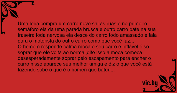 O homem responde calma moca o seu carro é inflável é so soprar que ele volta ao normal,dito isso a moca comeca desesperadamente soprar pelo escapamento para encher o carro nisso aparece sua melhor amiga e diz o que você está fazendo sabe o que é o homen que bateu no meu carro disse....