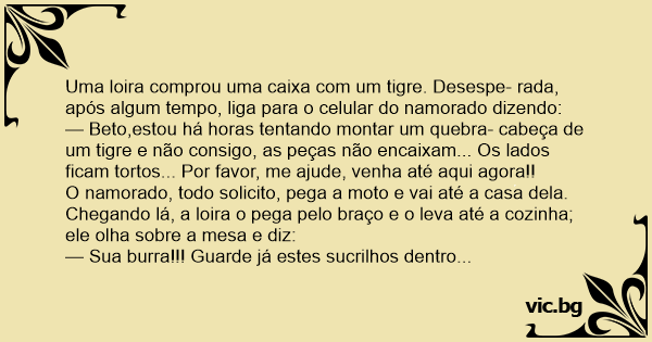 A loira liga desesperada para o namorado: — Meu amor preciso de ajuda. — O que aconteceu querida - pergunta o namorado. — Estou a horas tentando montar um quebra cabeça de um tigre mas nãom consigo...