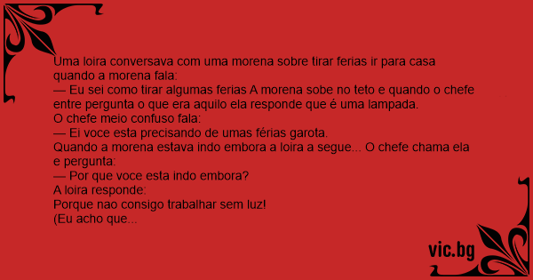 — Eu sei como tirar algumas ferias A morena sobe no teto e quando o chefe entre pergunta o que era aquilo ela responde que é uma lampada.