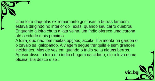 A loira, que não tem muitas opções, aceita. Ela моnта na garupa e o cavalo sai galopando. A viagem segue tranqüila e sem grandes incidentes. Mas de vez em quando o índio solta alguns berros.