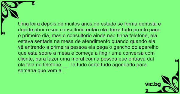 Uma loira depois de muitos anos de estudo se forma dentista e decide abrir o seu consultório então ela deixa tudo pronto para o primeiro dia, mas o consultorio ainda nao tinha telefone, ela estava sentada na mesa de atendimento quando quando ela vê entrando a primeira pessoa ela pega o gancho do aparelho que esta sobre a mesa e começa a fingir uma conversa com cliente, para fazer uma moral com a pessoa que entrava daí ela fala no telefone __ Tá tudo certo tudo agendado para semana que vem a consulta do seu marido a da sua filha, do seu filho, e a sua. Voce sabe como é ser uma dentista famosa minha agenda ja ta cheia essa semana mas pode deixar comigo nao vou esquecer, tchau.