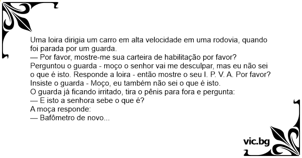 — Por favor, mostre-me sua carteira de habilitação por favor? Perguntou o guarda - moço o senhor vai me desculpar, mas eu não sei o que é isto. Responde a loira - então mostre o seu I. P. V. A. Por favor? Insiste o guarda - Moço, eu também não sei o que é isto.