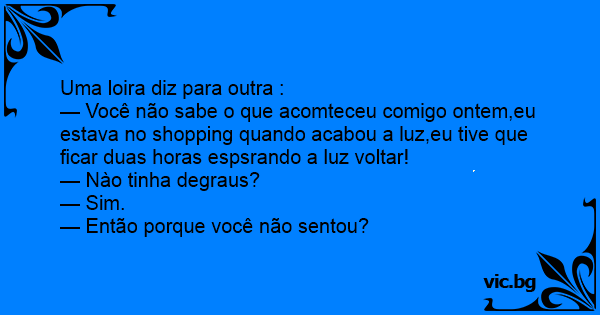 — Você não sabe o que acomteceu comigo ontem,eu estava no shopping quando acabou a luz,eu tive que ficar duas horas espsrando a luz voltar!