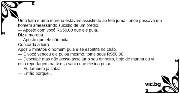 — Desculpe mas não posso asseitar o seu dinheiro, hoje de manha eu vi esta reportagem na tv e ja sabia que ele iria pular.