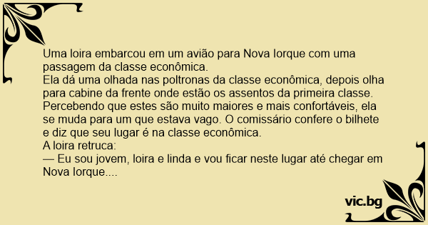 — Eu sou jovem, loira e linda e vou ficar neste lugar até chegar em Nova Iorque. Desconcertado, o comissário vai até a cabine e informa ao comandante o problema com a loira. O comandante vai até ela e explica que o assento a que ela tem direito é no setor econômico. Ela insiste: