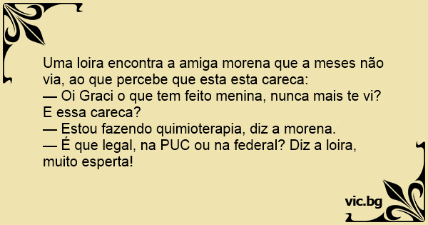 — É que legal, na PUC ou na federal? Diz a loira, muito esperta!