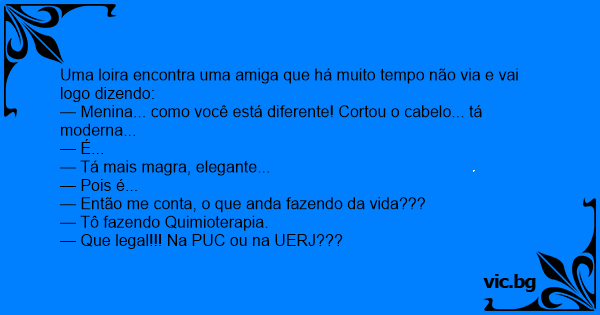 Uma loira encontra uma amiga que há muito tempo não via e vai logo dizendo: