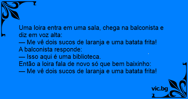Uma loira entra em uma sala, chega na balconista e diz em voz alta: