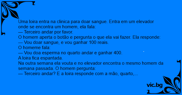 Uma loira entra na clinica para doar sangue. Entra em um elevador onde se encontra um homem, ela fala: