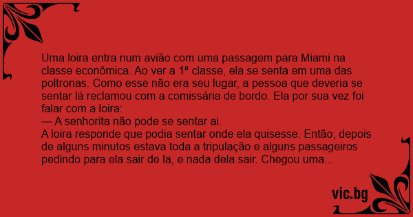 Uma loira entra num avião com uma passagem para Miami na classe econômica. Ao ver a 1ª classe, ela se senta em uma das poltronas. Como esse não era seu lugar, a pessoa que deveria se sentar lá reclamou com a comissária de bordo. Ela por sua vez foi falar com a loira: