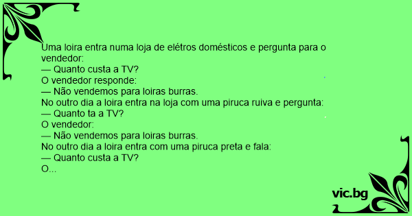 Uma loira foi em uma loja comprar uma tv. Chegando lá ela falou para o vendedor: — - EU quero comprar essa tv. E o vendedor disse: — - Não vendemos pra loiras. Ela tinge o cabelo de preto e volta...