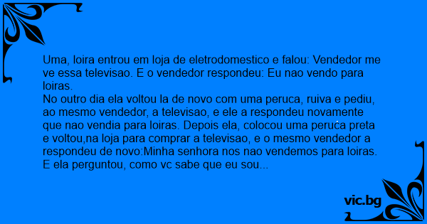 Uma loira foi em uma loja comprar uma tv. Chegando lá ela falou para o vendedor: — - EU quero comprar essa tv. E o vendedor disse: — - Não vendemos pra loiras. Ela tinge o cabelo de preto e volta...