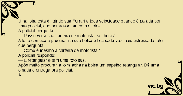 Uma loira está dirigindo sua Ferrari a toda velocidade quando é parada por uma policial, que por acaso também é loira.
