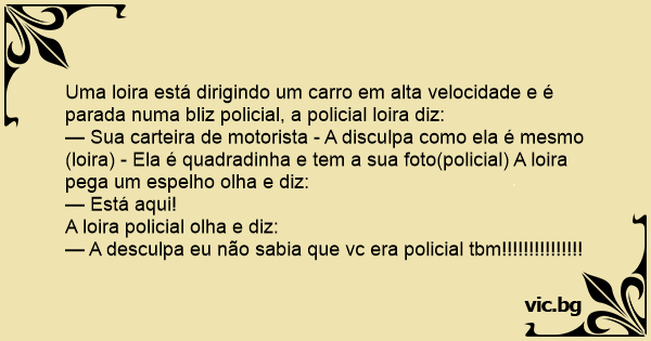 — Sua carteira de motorista - A disculpa como ela é mesmo(loira) - Ela é quadradinha e tem a sua foto(policial) A loira pega um espelho olha e diz: