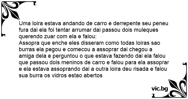 Assopra que enche eles disseram como todas loiras sao burras ela pegou e comecou a assoprar dai chegou a amiga dela e perguntou o que estava fazendo dai ela falou que passou dois meninos de carro e falou para ela assoprar e ela estava assoprando dai a outra loira deu risada e falou sua burra os vidros estao abertos