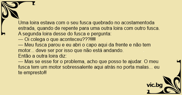 Uma loira estava com o seu fusca quebrado no acostamentoda estrada, quando de repente para uma outra loira com outro fusca. A segunda loira desse do fusca e pergunta: