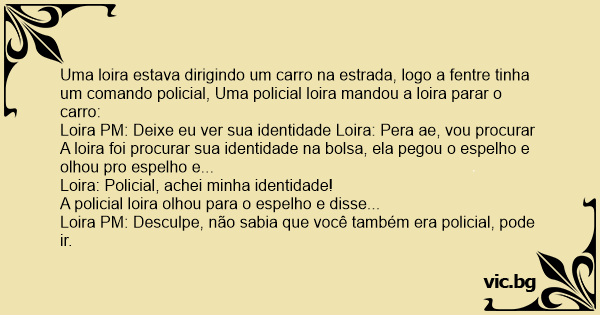 Loira PM: Deixe eu ver sua identidade Loira: Pera ae, vou procurar A loira foi procurar sua identidade na bolsa, ela pegou o espelho e olhou pro espelho e...
