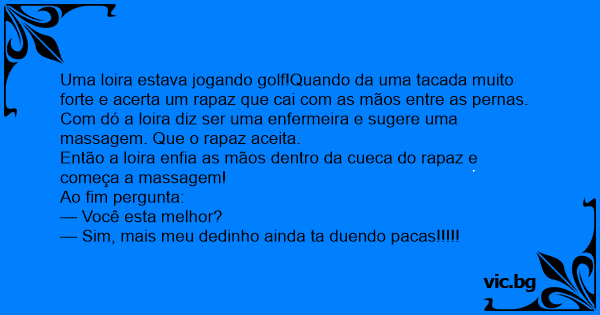 Uma loira esta jogando golfe quando da uma tacada e acerta um homem que logo cai no chão,a loira sai correndo e pergunta ao homem: — Você esta bem?o que aconteceu? Dai ela repara que o cara esta...