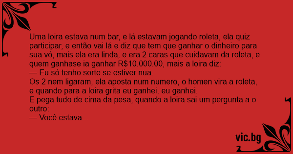 Uma loira estava num bar, e lá estavam jogando roleta, ela quiz participar, e então vai lá e diz que tem que ganhar o dinheiro para sua vó, mais ela era linda, e era 2 caras que cuidavam da roleta, e quem ganhase ia ganhar R$10.000.00, mais a loira diz: