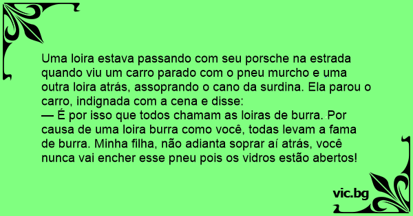 — É por isso que todos chamam as loiras de burra. Por causa de uma loira burra como você, todas levam a fama de burra. Minha filha, não adianta soprar aí atrás, você nunca vai encher esse pneu pois os vidros estão abertos!