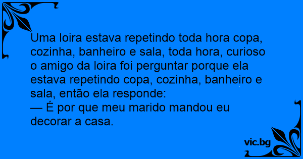 Uma loira estava repetindo toda hоrа copa, cozinha, banheiro e sala, toda hоrа, curioso o amigo da loira foi perguntar porque ela estava repetindo copa, cozinha, banheiro e sala, então ela responde: