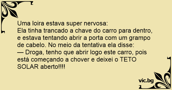 — Droga, tenho que abrir logo este carro, pois está começando a chover e deixei o TETO SOLAR aberto!!!!