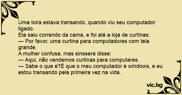 — Sabe o que é?É que o meu computador é windows, e eu estou transando pela primeira vez na vida.