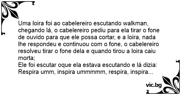 Uma loira foi ao cabelereiro escutando walkman, chegando lá, o cabelereiro pediu para ela tirar o fone de ouvido para que ele possa cortar, e a loira, nada lhe respondeu e continuou com o fone, o cabelereiro resolveu tirar o fone dela e quando tirou a loira caiu morta;