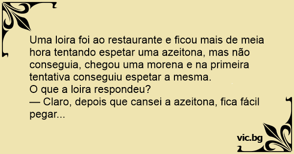 Uma loira foi ao restaurante e ficou mais de meia hоrа tentando espetar uma azeitona, mas não conseguia, chegou uma morena e na primeira tentativa conseguiu espetar a mesma.