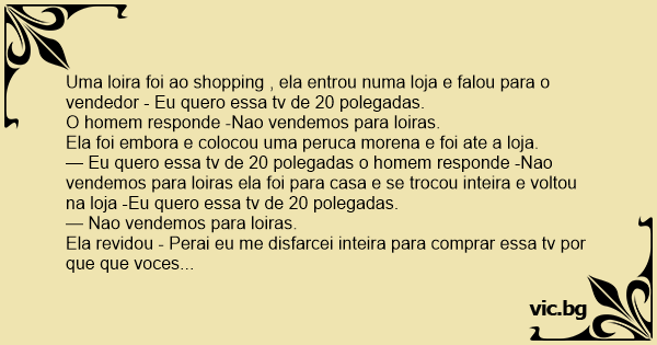 — Eu quero essa tv de 20 polegadas o homem responde -Nao vendemos para loiras ela foi para casa e se trocou inteira e voltou na loja -Eu quero essa tv de 20 polegadas.