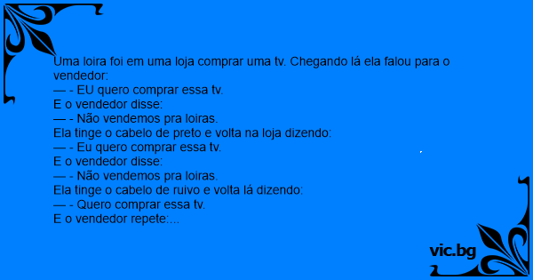 Um dia uma loira foi numa loja conprar uma televisao e pergunta para o comerciante: Quantovale essa tv???? O comerciante responde não vendemos!!! Ai a lora foi en casa e pintou o cabelo de ruivo...
