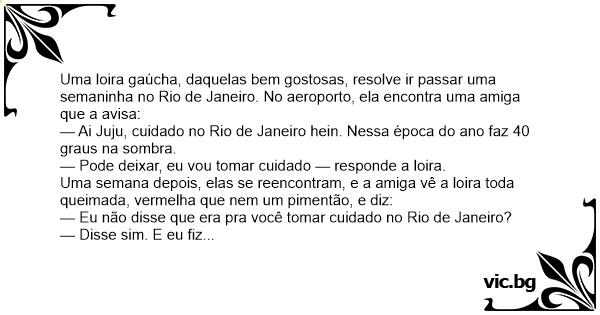 Uma loira gaúcha, daquelas bem gostosas, resolve ir passar uma semaninha no Rio de Janeiro. No aeroporto, ela encontra uma amiga que a avisa:
