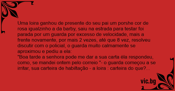 Uma loira ganhou de presente do seu pai um porshe cor de rosa igualzinho a da barby, saiu na estrada para testar foi parada por um guarda por excesso de velocidade, mais a frente novamente, por mais 2 vezes, até que 8 vez, resolveu discutir com o policial, o guarda muito calmamente se aproximou e pediu a ela: