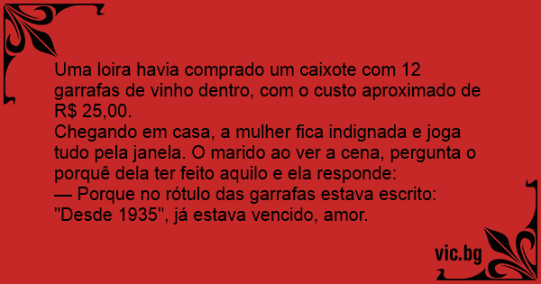 Uma loira havia comprado um caixote com 12 garrafas de vinho dentro, com o custo aproximado de R$ 25,00.