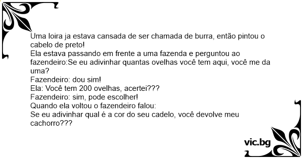 Ela estava passando em frente a uma fazenda e perguntou ao fazendeiro:Se eu adivinhar quantas ovelhas você tem aqui, você me da uma?