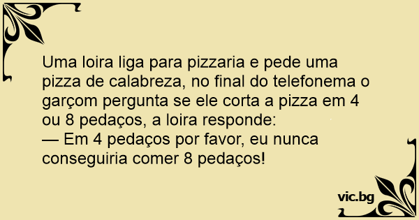 Uma loira liga para pizzaria e pede uma pizza de calabreza, no final do telefonema o garçom pergunta se ele corta a pizza em 4 ou 8 pedaços, a loira responde:
