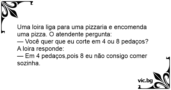 — Em 4 pedaços,pois 8 eu não consigo comer sozinha.