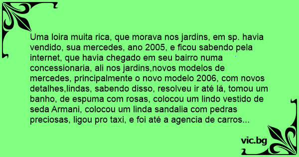 Uma loira muita rica, que morava nos jardins, em sp. havia vendido, sua mercedes, ano 2005, e ficou sabendo pela internet, que havia chegado em seu bairro numa concessionaria, ali nos jardins,novos modelos de mercedes, principalmente o novo modelo 2006, com novos detalhes,lindas, sabendo disso, resolveu ir até lá, tomou um banho, de espuma com rosas, colocou um lindo vestido de seda Armani, colocou um linda sandalia com pedras preciosas, ligou pro taxi, e foi até a agencia de carros importados, chegando la subiu a rampa de acesso, entrando dentro da concessionaria,soltou umn реidо daqueles bem fedido, azulou,o lugar que ela estava, muito fina, olhou para lado, olhou pro outro lado, nada .. a hоrа que ela olhou para traz estava o vendedor de carros, ficou sem jeito, começou a disfaçar, a dar desculpa que o carro éra um luxo, lindo,maravilhoso, e perguntou, pro moço quanto custava aquele novo modelo de mercedes.