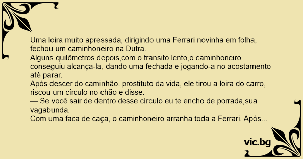 Muito louco, rasgou todos os bancos da Ferrari deu um chute na porta e furou os quatro pneus, e ao olhar para a loira ela estava quase sem ar de tanto rir.