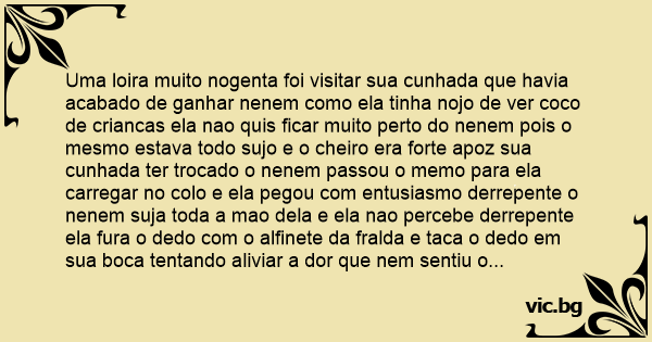 Uma loira muito nogenta foi visitar sua cunhada que havia acabado de ganhar nenem como ela tinha nojo de ver coco de criancas ela nao quis ficar muito perto do nenem pois o mesmo estava todo sujo e o cheiro era forte apoz sua cunhada ter trocado o nenem passou o memo para ela carregar no colo e ela pegou com entusiasmo derrepente o nenem suja toda a mao dela e ela nao percebe derrepente ela fura o dedo com o alfinete da fralda e taca o dedo em sua boca tentando aliviar a dor que nem sentiu o gosto nem o cheiro da меrdа do nenem .