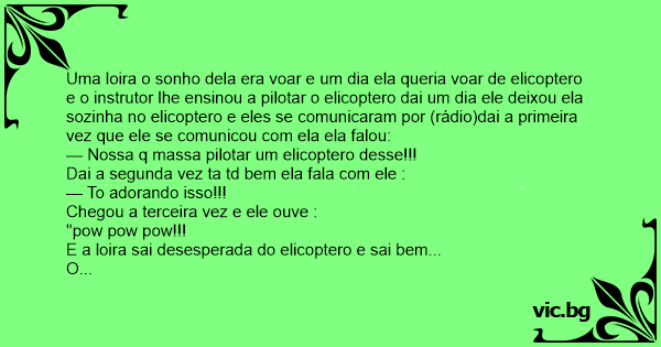 Uma loira o sonho dela era voar e um dia ela queria voar de elicoptero e o instrutor lhe ensinou a pilotar o elicoptero dai um dia ele deixou ela sozinha no elicoptero e eles se comunicaram por (rádio)dai a primeira vez que ele se comunicou com ela ela falou: