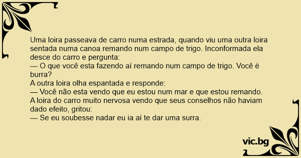 Uma loira passeava de carro numa estrada, quando viu uma outra loira sentada numa canoa remando num campo de trigo. Inconformada ela desce do carro e pergunta: