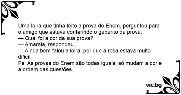 Uma loira que tinha feito a prova do Enem, perguntou para o amigo que estava conferindo o gabarito da prova: