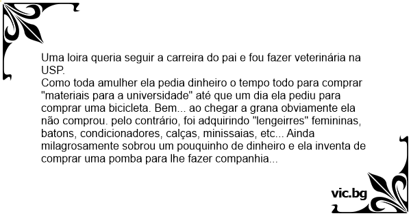 Como toda amulher ela pedia dinheiro o tempo todo para comprar "materiais para a universidade" até que um dia ela pediu para comprar uma bicicleta. Bem... ao chegar a grana obviamente ela não comprou. pelo contrário, foi adquirindo "lengeirres" femininas, batons, condicionadores, calças, minissaias, etc... Ainda milagrosamente sobrou um pouquinho de dinheiro e ela inventa de comprar uma pomba para lhe fazer companhia no apartamento, onde morava sozinha.