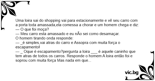 A loira para o caro no supermercado e quando volta, nota um amassado na lateral do carro, nisso passa um cara e diz o seguinde?: — Assopra no escapamento que desamassa!! Então a loira começa a...