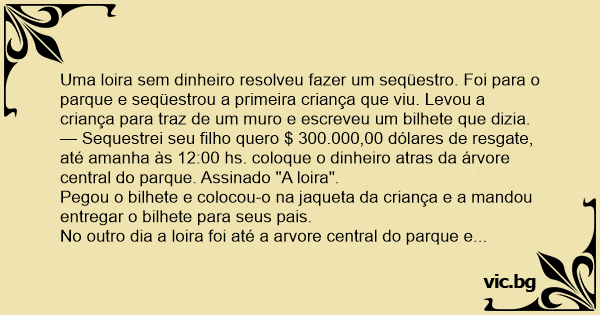 — Sequestrei seu filho quero $ 300.000,00 dólares de resgate, até amanha às 12:00 hs. coloque o dinheiro atras da árvore central do parque. Assinado "A loira".