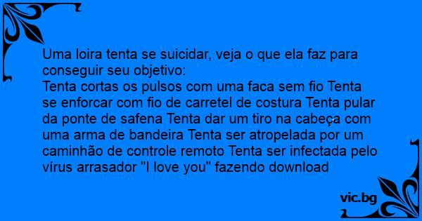 Tenta cortas os pulsos com uma faca sem fio Tenta se enforcar com fio de carretel de costura Tenta pular da ponte de safena Tenta dar um tiro na cabeça com uma arma de bandeira Tenta ser atropelada por um caminhão de controle remoto Tenta ser infectada pelo vírus arrasador "I love you" fazendo download