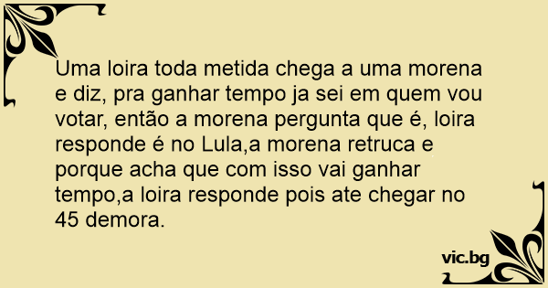Uma loira toda metida chega a uma morena e diz, pra ganhar tempo ja sei em quem vou votar, então a morena pergunta que é, loira responde é no Lula,a morena retruca e porque acha que com isso vai ganhar tempo,a loira responde pois ate chegar no 45 demora.