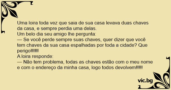 Uma loira toda vez que saia de sua casa levava duas chaves da casa, e sempre perdia uma delas.