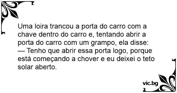 Uma loira trancou a porta do carro com a chave dentro do carro e, tentando abrir a porta do carro com um grampo, ela disse: